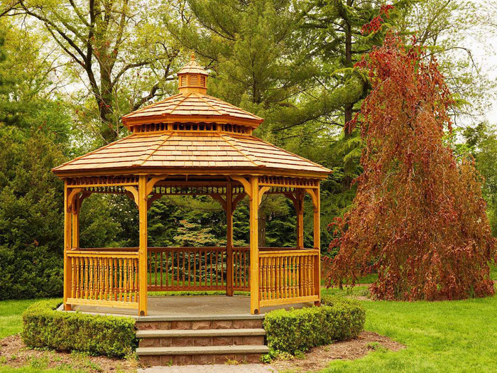 組建而成的涼亭。所使用的防腐木是經(jīng)過特殊防腐工藝處理后的木材,具有防腐爛、防白蟻、防真菌的功效。故此類涼亭穩(wěn)定性強、使用期限長、性價比高。